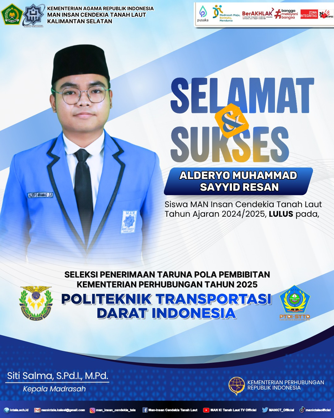 (Tanah Laut) MAN ICT - Madrasah Aliyah Negeri Insan Cendekia Tanah Laut (MAN ICT) kembali menorehkan prestasi membanggakan. Salah satu alumninya, Alderyo Muhammad Sayyid Resan, berhasil lulus seleksi penerimaan taruna Pola Pembibitan Kementerian Perhubungan Tahun 2025 di Politeknik Transportasi Darat Indonesia (PTDI-STTD).