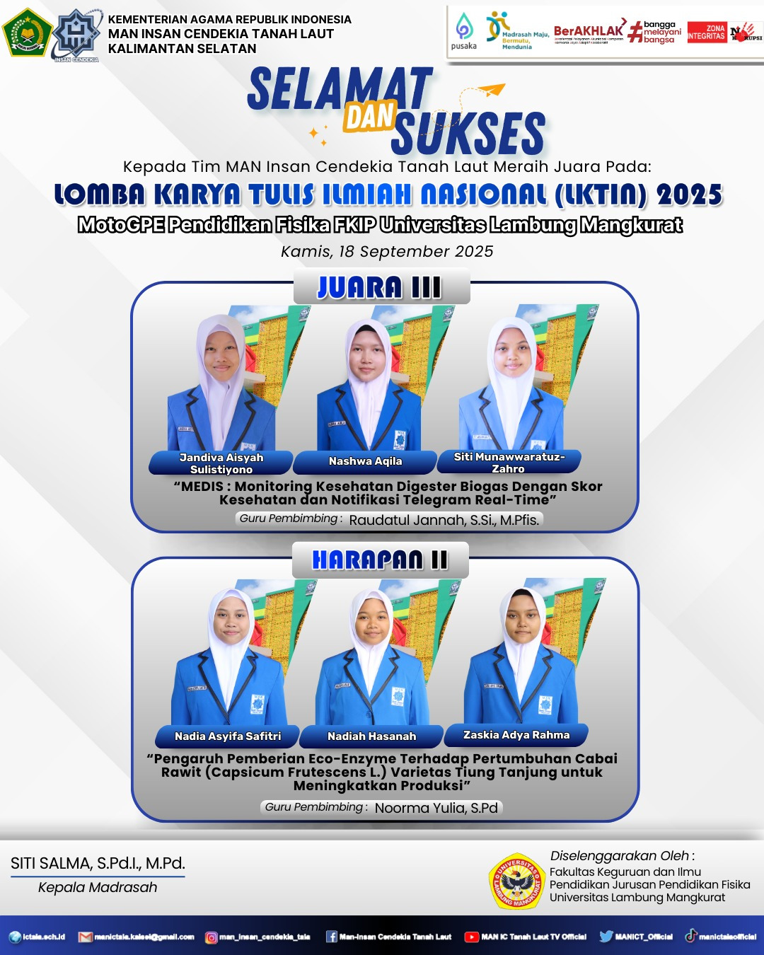 TANAH LAUT (MAN ICT) — Dua Tim Riset Madrasah Aliyah Negeri Insan Cendekia Tanah Laut (MAN ICT) kembali mengukir prestasi gemilang di tingkat nasional. Dalam Lomba Karya Tulis Ilmiah Nasional (LKTIN) 2025 yang diselenggarakan oleh MotoGPE Pendidikan Fisika FKIP Universitas Lambung Mangkurat, dua tim perwakilan MAN IC Tanah Laut berhasil meraih juara.