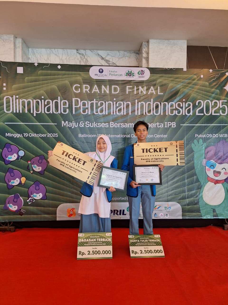 Dua siswa berprestasi tersebut adalah Hafidzah Nur Azizah Zein, yang berhasil meraih penghargaan Gagasan Terbaik sekaligus mendapatkan Golden Ticket IPB, serta Muhammad Ilhami yang memperoleh predikat Karya Tulis Terbaik Kategori Anak Petani Berprestasi. Keduanya dibimbing oleh guru pembina, Fitriani, yang selama ini mendampingi proses riset dan penulisan karya ilmiah mereka.