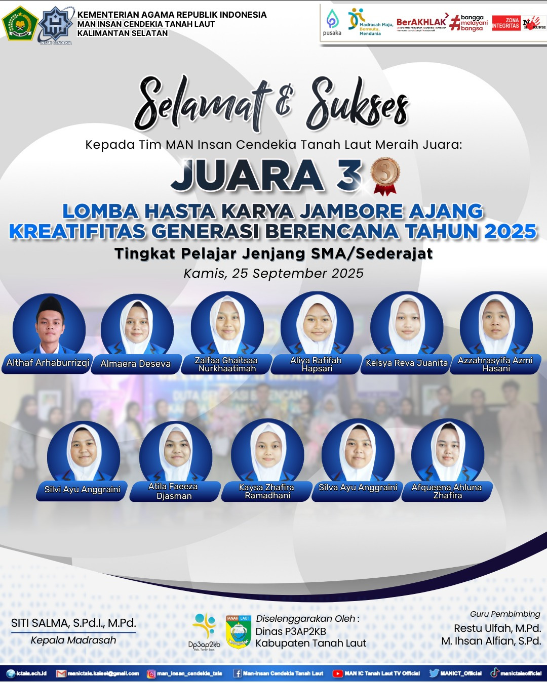 Tanah Laut (MAN ICT) - Tim Madrasah Aliyah Negeri Insan Cendekia Tanah Laut (MAN ICT) berhasil meraih Juara 3 Lomba Hasta Karya pada ajang Jambore Ajang Kreativitas Generasi Berencana (GENRE) Tahun 2025 tingkat pelajar jenjang SMA/sederajat yang diselenggarakan oleh Dinas P3AP2KB Kabupaten Tanah Laut.