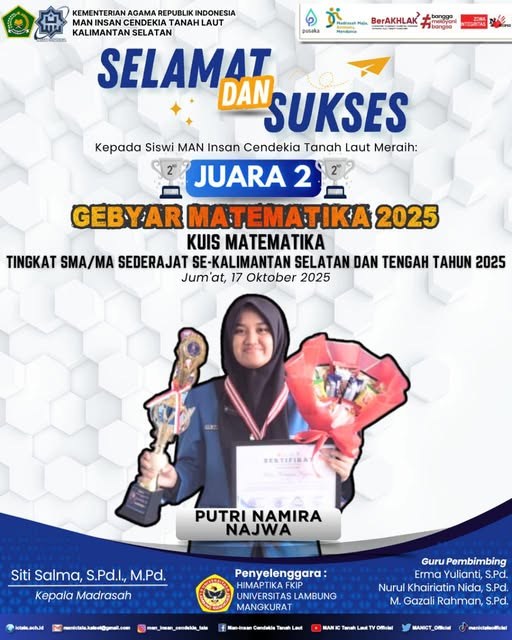 Tanah Laut (MAN ICT) -  Prestasi kembali ditorehkan oleh salah satu siswi Madrasah Aliyah Negeri Insan Cendekia Tanah Laut (MAN ICT), Putri Namira Najwa, yang berhasil meraih Juara 2 Gebyar Matematika 2025 tingkat SMA/MA se-Kalimantan Selatan dan Kalimantan Tengah. Ajang bergengsi ini diselenggarakan oleh HIMAPTIKA FKIP Universitas Lambung Mangkurat (ULM) pada Jumat, 17 Oktober 2025, dan diikuti oleh ratusan peserta dari berbagai sekolah unggulan di dua provinsi.  Keberhasilan ini juga tak lepas dari bimbingan para guru hebat MAN ICT, yakni Erma Yulianti, S.Pd., Nurul Khairiatin Nida, S.Pd., dan M. Gazali Rahman, S.Pd.