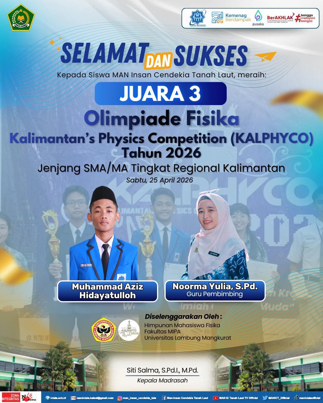 Siswa Madrasah Aliyah Negeri Insan Cendekia Tanah Laut (MAN ICT), Muhammad Aziz Hidayatulloh yang dibimbing oleh guru Fisika, Noorma Yulia kembali menorehkan prestasi membanggakan dengan meraih Juara 3 pada Olimpiade Fisika Kalimantan’s Physics Competition (KALPHYCO) Tahun 2026 tingkat Regional Kalimantan.