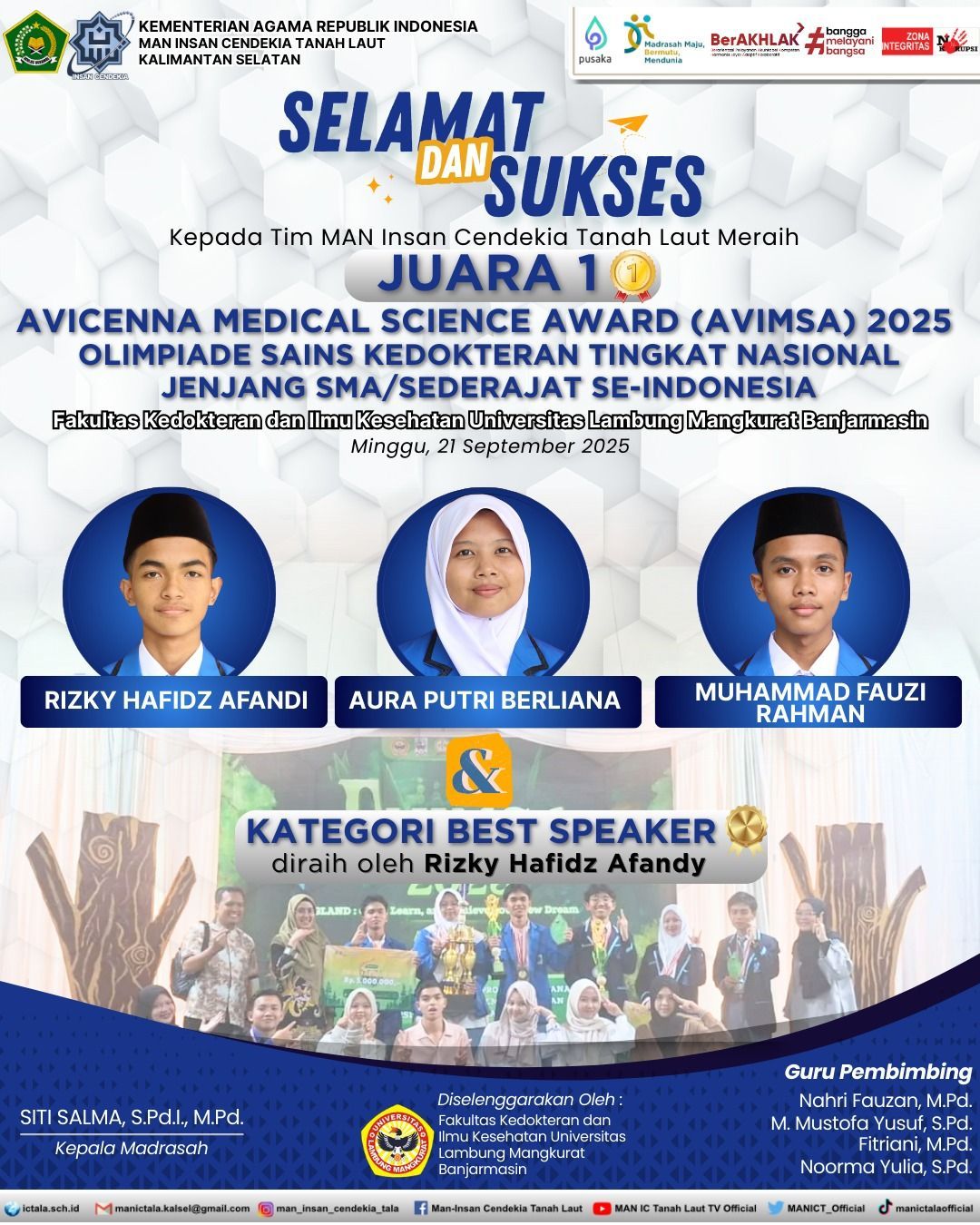 Tanah Laut (MAN ICT) – Prestasi gemilang kembali ditorehkan oleh peserta didik Madrasah Aliyah Negeri Insan Cendekia Tanah Laut (MAN ICT). Tim MAN ICT berhasil meraih Juara 1 pada ajang Avicenna Medical Science Award (AVIMSA) 2025, Olimpiade Sains Kedokteran tingkat nasional jenjang SMA/sederajat se-Indonesia yang diselenggarakan oleh Fakultas Kedokteran dan Ilmu Kesehatan Universitas Lambung Mangkurat Banjarmasin pada Minggu, 21 September 2025.