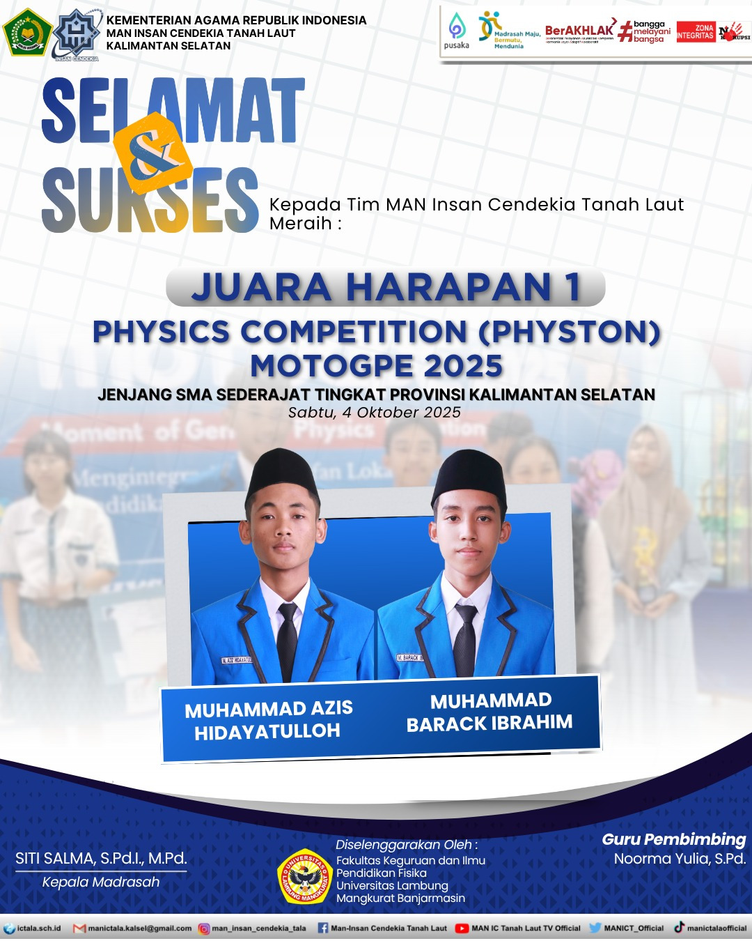 Pelaihari (MAN ICT) –Prestasi kembali ditorehkan oleh siswa Madrasah Aliyah Negeri Insan Cendekia Tanah Laut (MAN ICT) dalam ajang Physics Competition (Physton) MOTOGPE 2025 tingkat Provinsi Kalimantan Selatan. Kompetisi yang digelar oleh Fakultas Keguruan dan Ilmu Pendidikan Fisika Universitas Lambung Mangkurat Banjarmasin pada Sabtu, 4 Oktober 2025 ini diikuti oleh puluhan peserta dari berbagai SMA/MA sederajat se-Kalimantan Selatan.