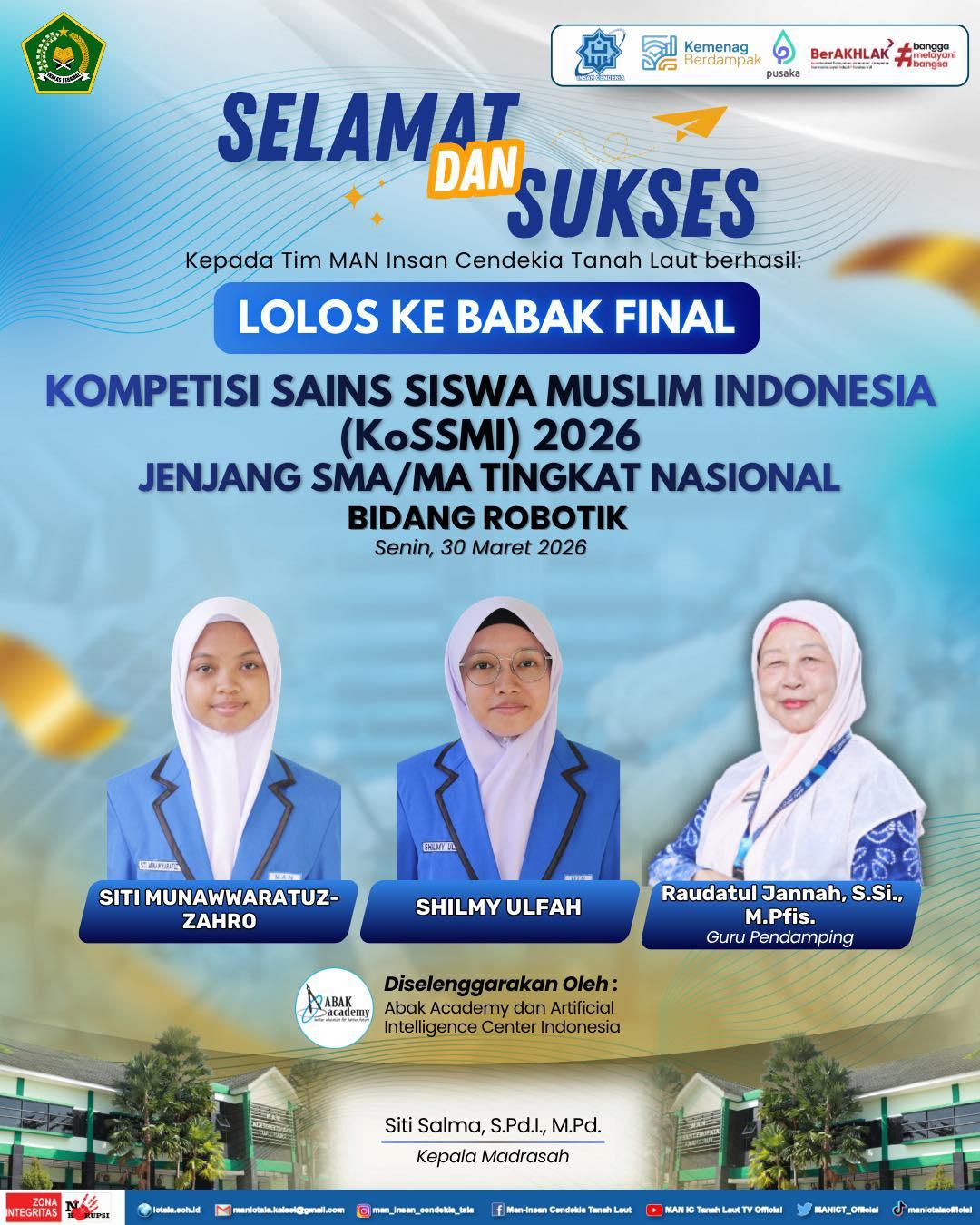 Tanah Laut — Prestasi membanggakan kembali ditorehkan oleh siswa Madrasah Aliyah Negeri Insan Cendekia Tanah Laut (MAN ICT). Tim robotik MAN ICT berhasil melaju ke babak final dalam ajang Kompetisi Sains Siswa Muslim Indonesia (KoSSMI) 2026 tingkat nasional untuk jenjang SMA/MA pada bidang robotik.