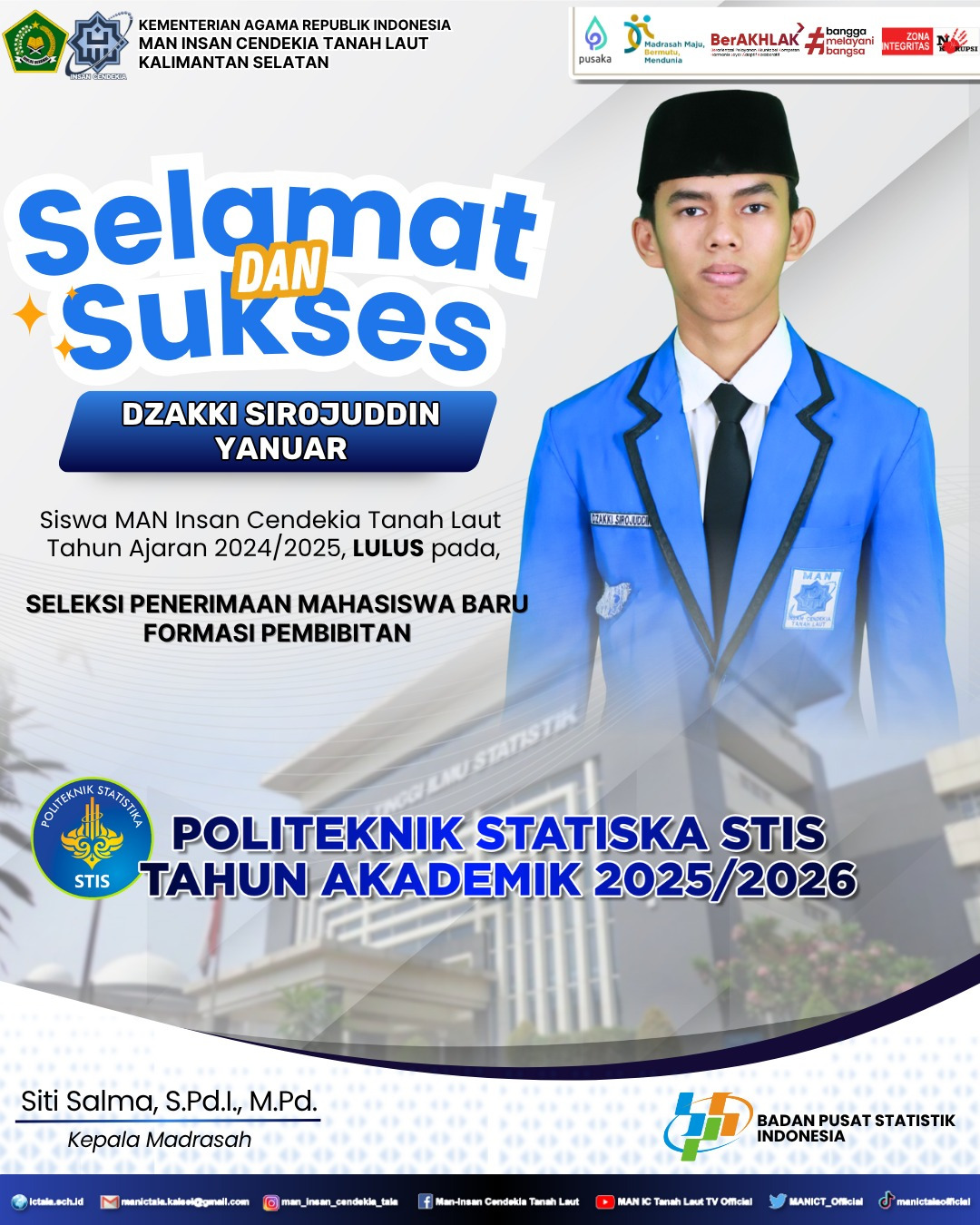 Tanah Laut, — Prestasi membanggakan kembali ditorehkan oleh Dzakki Sirojuddin Yanuar, Alumni MAN Insan Cendekia Tanah Laut generasi 7 yang berhasil lulus seleksi penerimaan mahasiswa baru Politeknik Statistika STIS Tahun Akademik 2025/2026 melalui formasi pembibitan Badan Pusat Statistik (BPS). Politeknik Statistika STIS perguruan tinggi kedinasan di bawah naungan Badan Pusat Statistik (BPS).