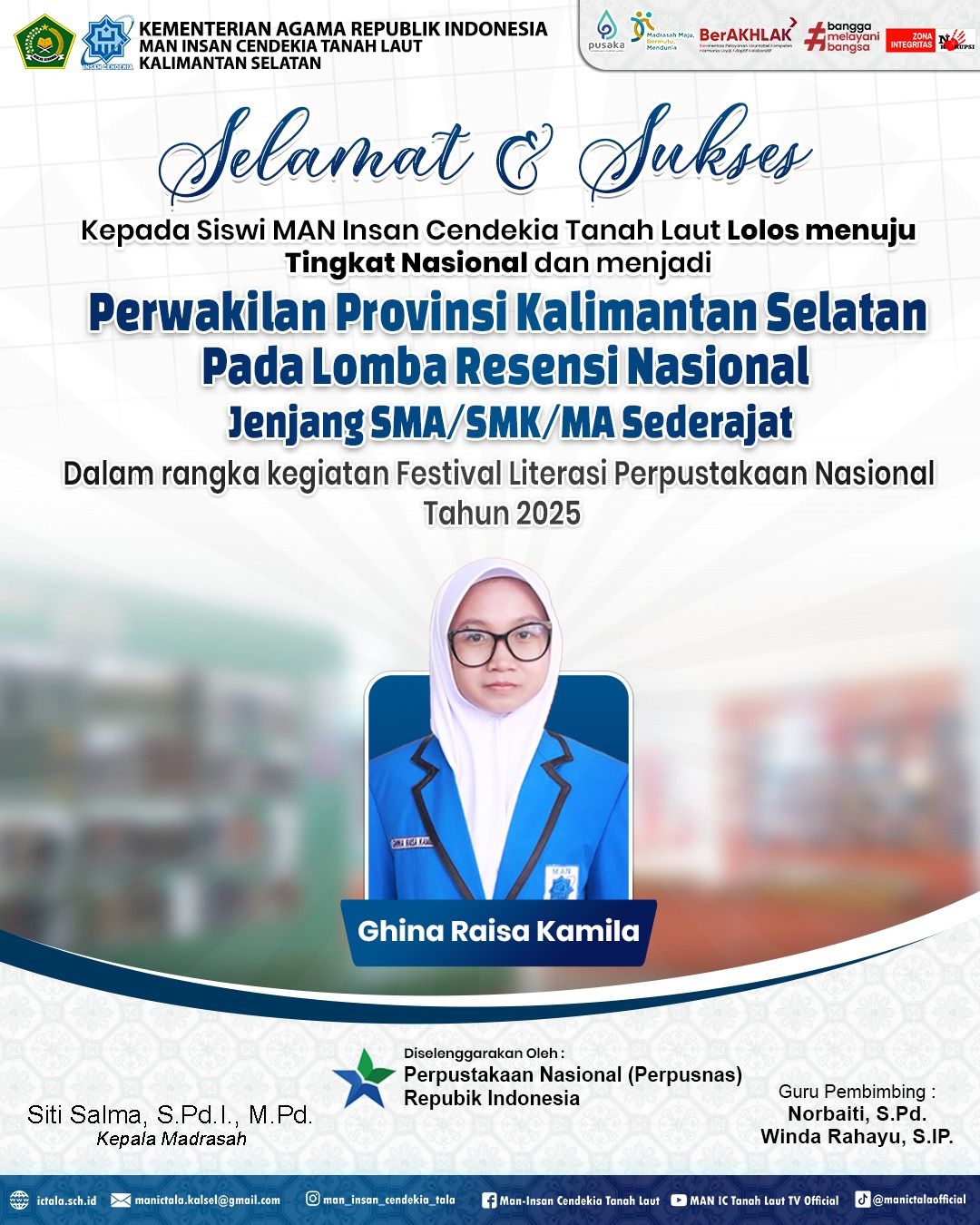 Pelaihari (MAN ICT) – Prestasi membanggakan kembali diraih oleh Madrasah Aliyah Negeri Insan Cendekia Tanah Laut (MAN ICT). Salah satu siswinya, Ghina Raisa Kamila, berhasil lolos ke Tingkat Nasional dalam ajang Lomba Resensi Buku jenjang SMA/SMK/MA sederajat pada Festival Literasi Perpustakaan Nasional Tahun 2025. Ghina terpilih menjadi perwakilan Provinsi Kalimantan Selatan, setelah melalui seleksi tingkat provinsi yang ketat.