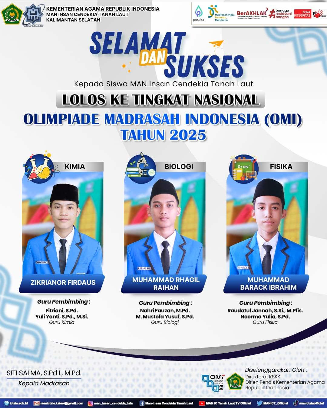 Tanah Laut (MAN ICT) - Madrasah Aliyah Negeri Insan Cendekia Tanah Laut (MAN ICT) kembali menorehkan prestasi gemilang di ajang Olimpiade Madrasah Indonesia (OMI) tahun 2025. Tiga siswa terbaik berhasil lolos ke tingkat nasional setelah melewati seleksi ketat tingkat provinsi Kalimantan Selatan. Mereka adalah Zikrianor Firdaus (bidang Kimia), dengan guru pembimbing Fitriani, S.Pd. dan Yuli Yanti, S.Pd., M.Si., Muhammad Rhagil Raihan (bidang Biologi), dengan guru pembimbing Nahri Fauzan, M.Pd. dan M. Mustofa Yusuf, S.Pd., dan Muhammad Barack Ibrahim (bidang Fisika), dengan guru pembimbing Raudatul Jannah, S.Si., M.Pfis. dan Noorma Yulia, S.Pd.